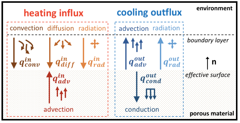 under the assumption that the surface behaves as a gray body. The effective heat conduction in the porous material is given by