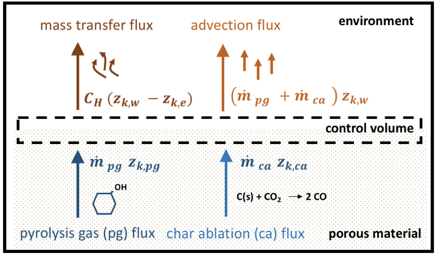 The pyrolysis gas production rate at the heatshield front surface \(\dot{m}_{pg}\) by integrating the pyrolysis, mass and transport equations. \(p_w\) and \(C_H\) are given by the aerothermal environment. \(T_w\) and \(C'_H\) are computed in the surface energy balance described below.