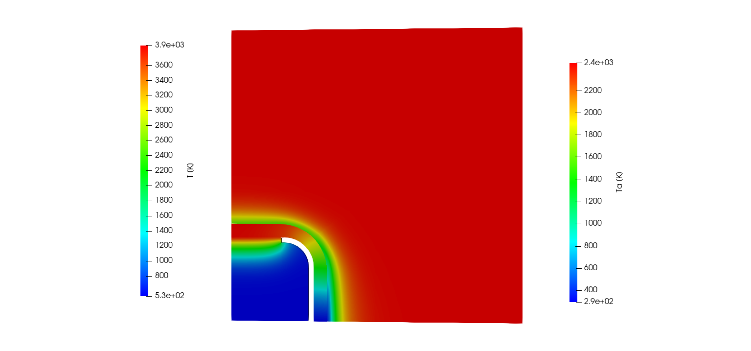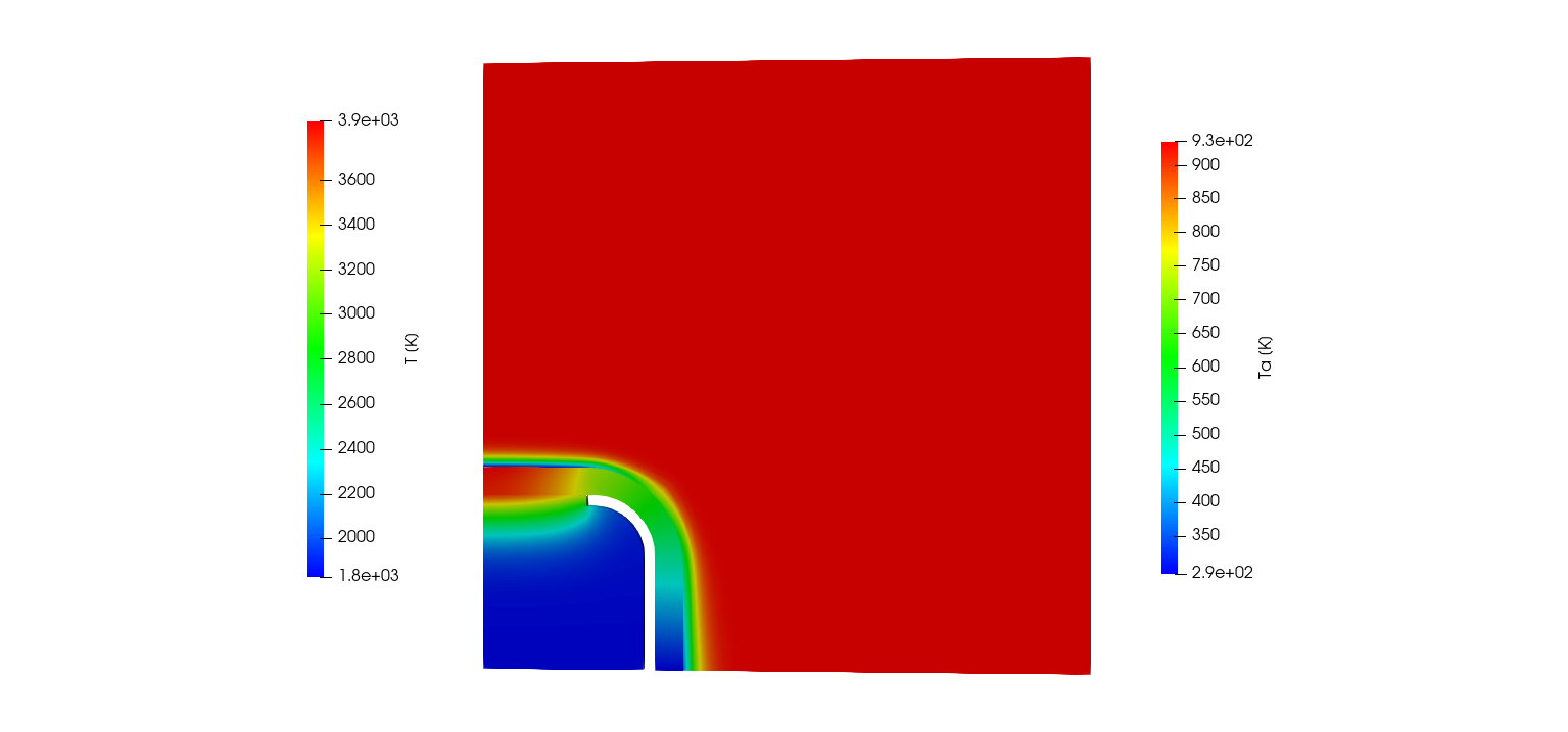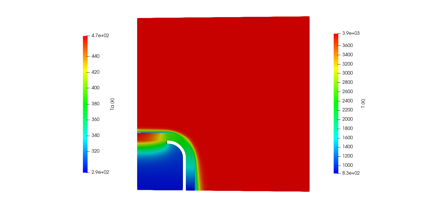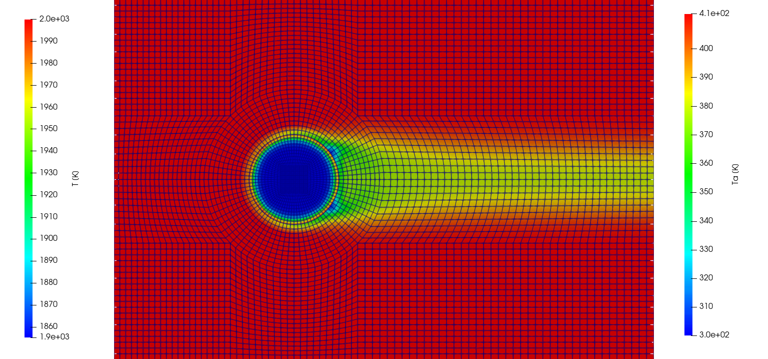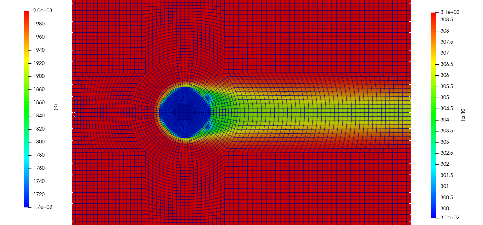 The ImmersedCylinder_Quarter_chtMultiRegionFoam tutorial computes the 2D symmetric thermal response of TACOT material inside a hot gas flow (Fig 1.35 and 1.36).