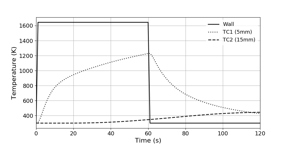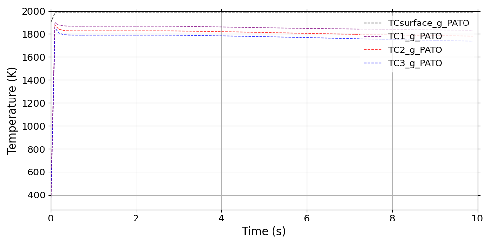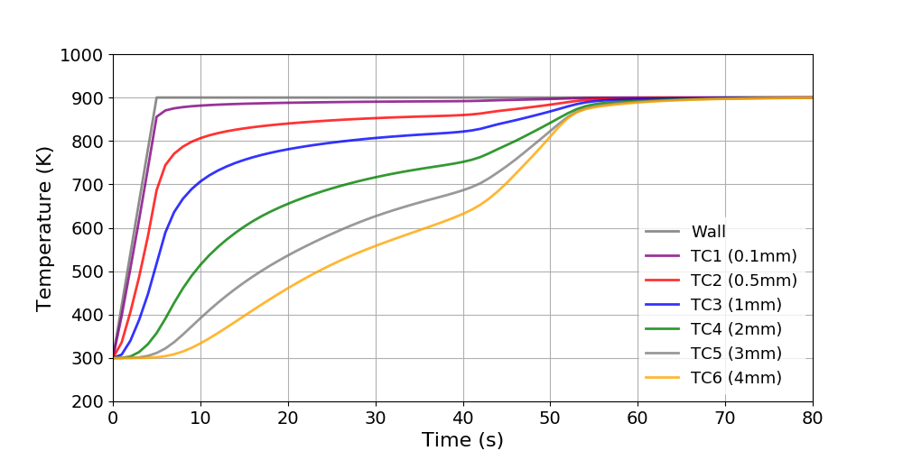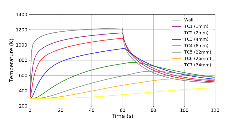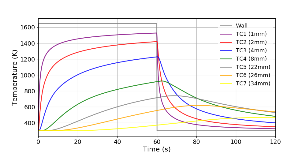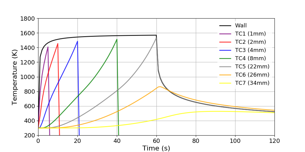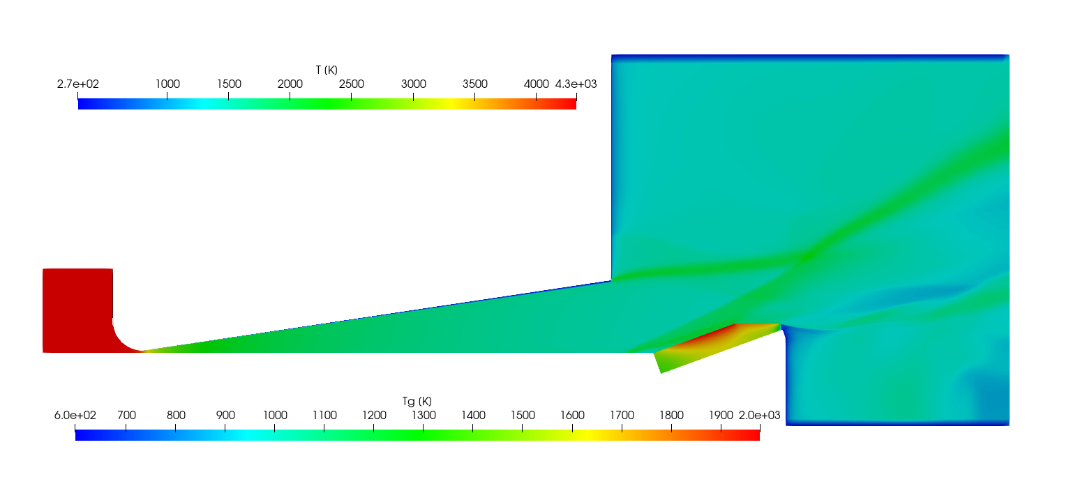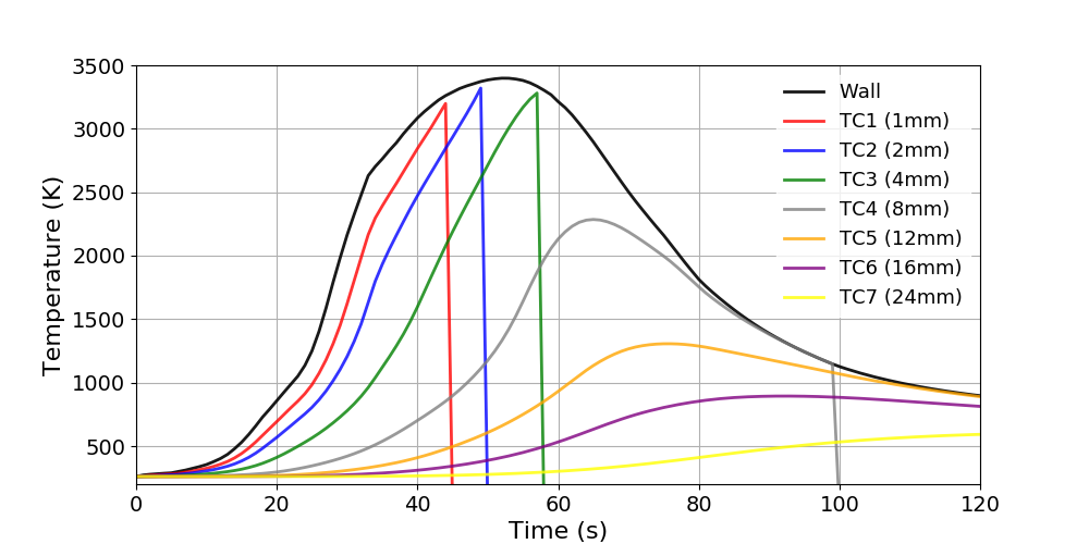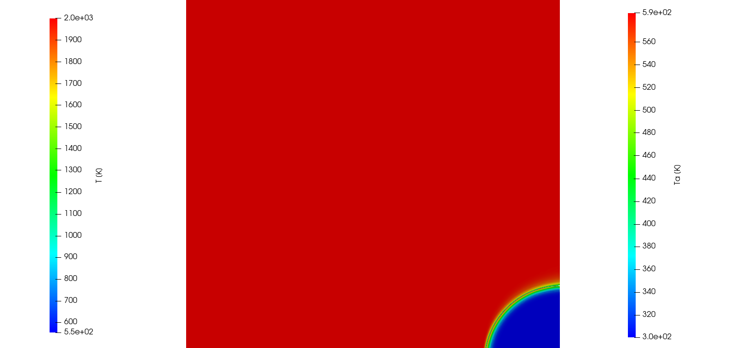 The ImmersedCylinder_Quarter_chtMultiRegionFoam tutorial computes the 2D symmetric thermal response of TACOT material inside a hot gas flow (Fig 1.35 and 1.36).