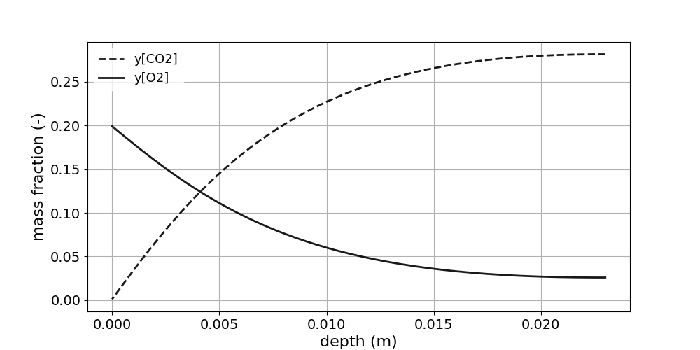 The AblationTestCase_1.0_equilibriumElementConservation tutorial computes the 1D thermal response of the TACOT material using the elemental mass conservation (Fig. 1.4). Table 1.2 shows the summary of the material sub-models used in this case. Listing [lis:1.0_elem] shows the porousMatProperties file and the different user material sub-models.