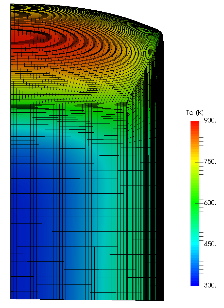 The Arcjet_cylinder_3D tutorial computes the 3D thermal response of the TACOT material (Fig. 1.46). This case uses the same inputs as .