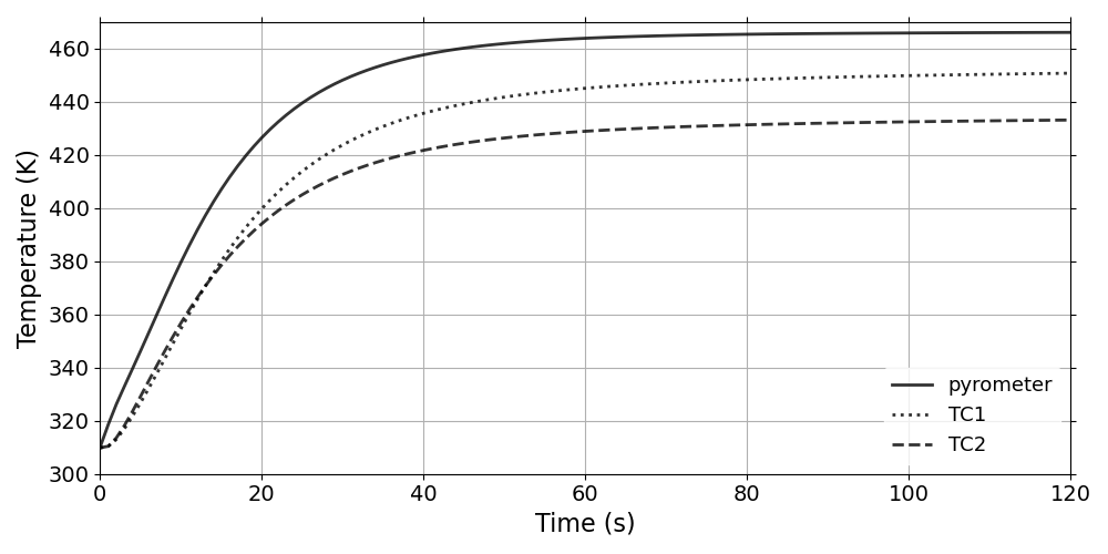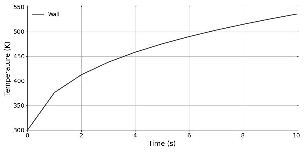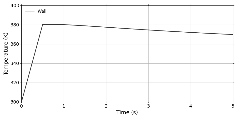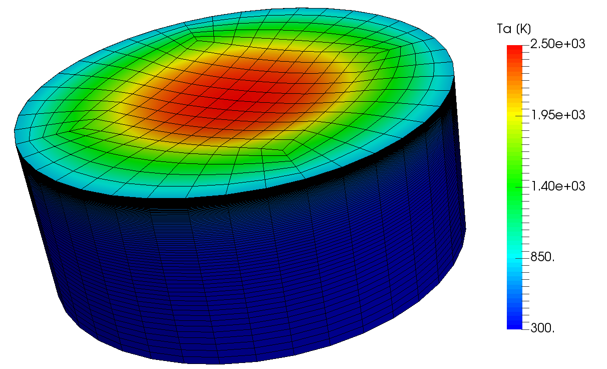 The writeFields input writes the Ta field every 0.1 s as defined in the controlDict file. The plotDict and surfacePatchDict files set the internal and the surface patch sampling configuration, coordinates and fields. Listing [lis:1.0_2] shows an example of Ta file that initializes the temperature. The dimension is Kelvin. All the internal cell centers have a uniform value of 300. The top boundary field varies linearly from 300 K to 1644 K during the first 0.1 s. The sides and bottom boundary fields have a zeroGradient boundary conditions (Eq. [eq:zeroGradient]).