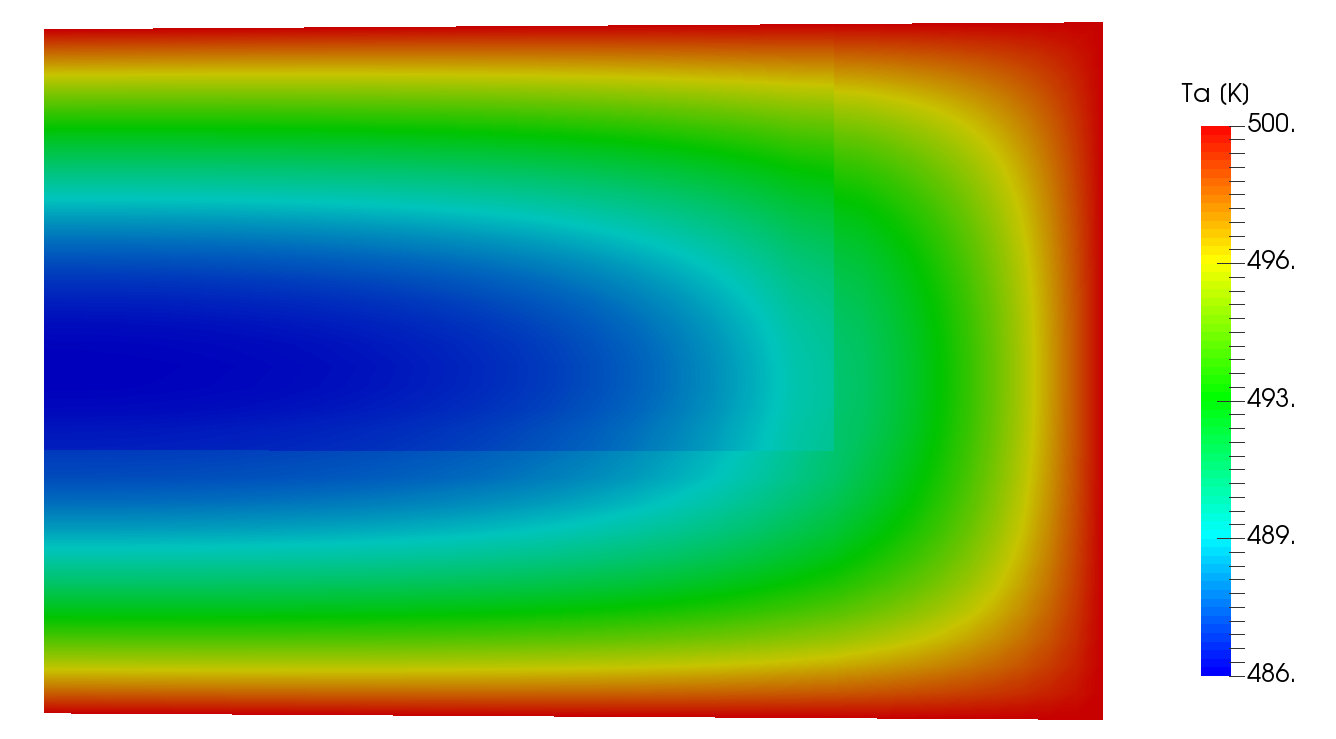 The Ma5ArcjetOnPorousFlatPlate computes the 2D thermal response of a plate of TACOT material inside a supersonic (\(Ma = 5\)) arc jet (Figure 1.37 and 1.38). It is possible to run simulations on each zone (fluid or porousMaterial) separately for uncoupled simulations or on both mesh simultaneously for coupled simulations. 4 Allrun files are available: