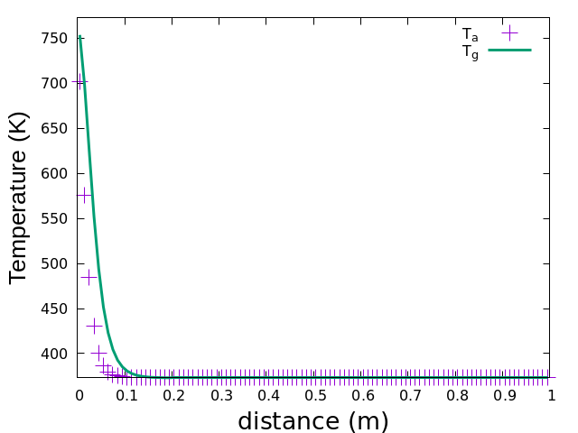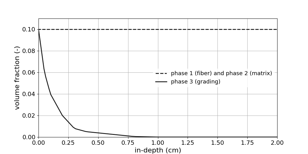 The AblationTestCase_1.0_grading tutorial computes the 1D thermal response of a porous material with a graded phase (Fig. 1.5). Table 1.3 shows the summary of the material sub-models used in this case. Listing [lis:1.0_grading] shows the porousMatProperties file and the different user material sub-models. Listing [lis:1.0_grading_2] and [lis:1.0_grading_3] show the grading properties file and the related gradedTACOT constant properties. The phase 3 has a graded volume fraction from 0.1 to 0.02 for the first in-depth millimeter in the y-axis.