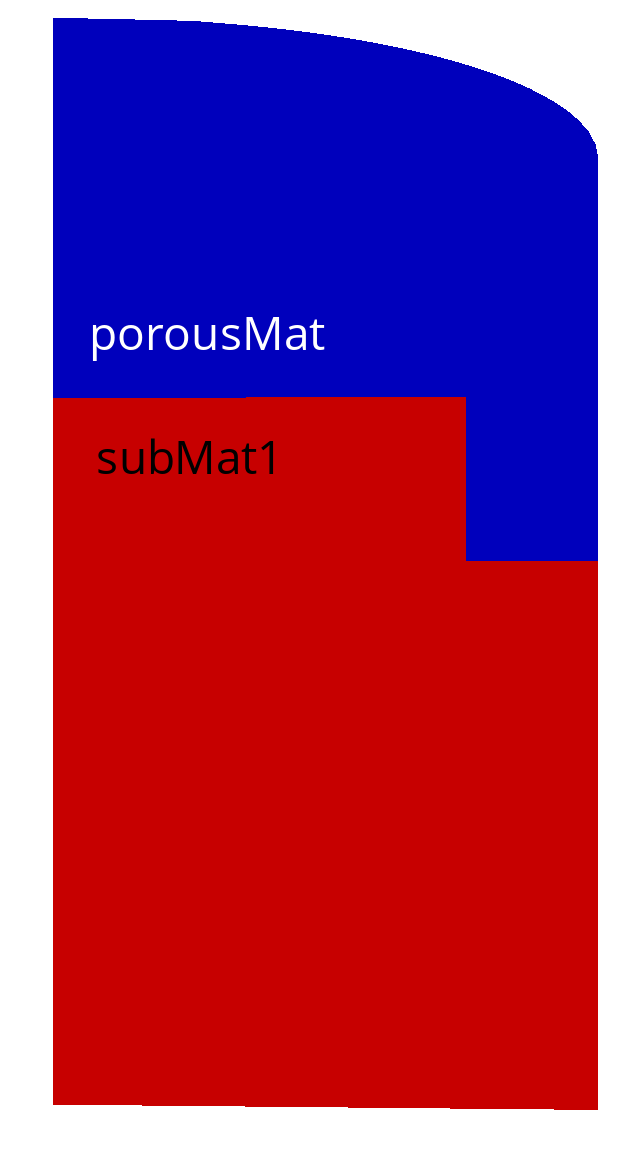 The QuartziteBed_thermal_load tutorial computes the 2D axisymetric thermo-mechanical response of the Quartzite bed material enclosed in a 16Mo3 steel (Fig 1.42). The 2 temperature thermal load is precalculated in the thermalLoad directory. Table 1.18 shows the summary of the porousMat material used in this case and Table 1.19 presents the summary of the tank material used in this case. Mechanical contact between the two material is not taken into account. There are only separated by difference in thermo-mechanical properties